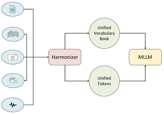 The implementation of Harmonizer faces several critical technical challenges. First, it must address the heterogeneity of input signals, handling differences in representation (e.g., audio waveforms versus image pixels) [,]. Second, temporal and spatial resolution pose challenges as sequences often vary in length and resolution []. Third, scalability is essential to maintain efficiency as both the number of modalities and the complexity of data increase [,]. Finally, preserving contextual semantics ensures accurate integration of cross-modal information (e.g., audio-text alignment) for coherent multimodal reasoning and inference []. In NLP, tokenization splits text into small units (words or subwords) and maps them to numbers that capture syntax and meaning []. In NLP, tokenization involves breaking text into smaller units (e.g., words or subwords) [,] and mapping them to numerical representations using a predefined vocabulary that captures the syntactic and semantic essence of the language []. These standardized representations enable LLMs to learn contextual relationships and nuances [,]. (In subsequent mentions, we refer to large language models (LLMs) and natural language processing (NLP) only by their abbreviations).