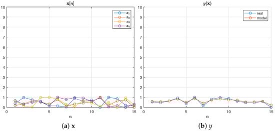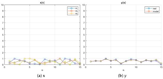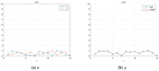 Under the assumption that the model realizes some process, observations of its development at some time points n give a set of real data that will be used to train the model. For the purposes of this study, in accordance with the model, we generate different data for any value of the vector parameter and different values of the model order p and the number of observation points N, and the inputs are generated randomly with a uniform distribution from the interval .