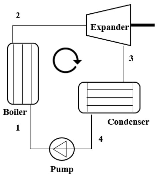 The heat input to the system via the boiler is determined using Equation (1). and represent the inlet and exit enthalpies of the boiler, as depicted in Figure 1. represents the mass flow of the working fluid flowing through the components.