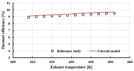Figure 4 presents the comparison between Wei et al. [] and the current model. Figure 4 demonstrates strong agreement across the examined exhaust temperature range (610–650 K), with thermal efficiency values consistently within a narrow margin. A maximum deviation of 2.37% is obtained between the reference study and the current model. In the current model, expansion is assumed to be isentropic, representing an idealized scenario with no entropy generation or internal irreversibilities. In contrast, the study by Wei et al. [] accounts for actual (non-isentropic) expansion, which inherently includes thermodynamic losses, leading to slightly lower predicted efficiencies. As a result, the current model tends to slightly overestimate thermal efficiency.