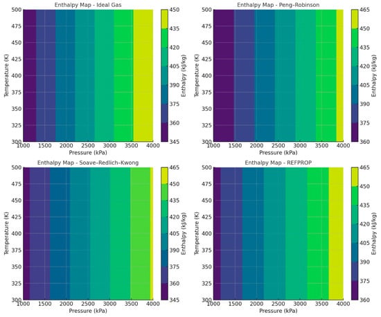 To assess the capability of each equation of state in representing thermodynamic behavior over a typical range of ORC operating conditions, enthalpy contour plots were generated for the temperature range of 300–500 K and pressure range of 1000–4000 kPa, as shown in Figure 5. This range spans both subcritical and superheated regions relevant to ORC systems. The REFPROP model yielded enthalpy values between 370 and 460 kJ/kg, characterized by smooth, continuous gradients that accurately capture real-fluid behavior, including phase transitions and superheated vapor characteristics. In contrast, the Ideal Gas equation of state consistently underestimated the energy content, producing lower enthalpy values in the range of approximately 350–450 kJ/kg, especially at higher pressures.