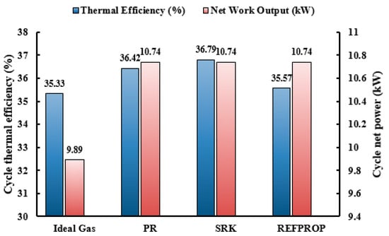 Figure 6 also presents the trend observed for net power output. It exhibits slight deviations from that of thermal efficiency. The Ideal Gas model yields the lowest net power output, slightly exceeding 9.89 kW, primarily due to its limited ability to accurately represent the enthalpy drop across the turbine and its oversimplified depiction of the expansion process. In contrast, the REFPROP, Soave–Redlich–Kwong, and Peng–Robinson models predict nearly identical net power outputs of approximately 10.74 kW, reflecting an improvement of up to 7.14% compared to the Ideal Gas estimate. The enhanced performance of the REFPROP model is attributed to its accurate thermophysical property predictions, especially in capturing the enthalpy increase during evaporation and the decrease during expansion. Although REFPROP offers superior thermodynamic accuracy, it demands substantially higher computational resources, with property evaluations requiring approximately 42% more CPU time compared to those based on cubic equation of state models. Similarly, the Peng–Robinson and Soave–Redlich–Kwong models achieve relatively high net outputs, ranging from 10.6 to 10.7 kW. These findings validate the reliability of cubic equation of state formulations for ORC performance evaluations, particularly in applications where reduced computational complexity is desired without significantly sacrificing the accuracy of critical performance indicators.