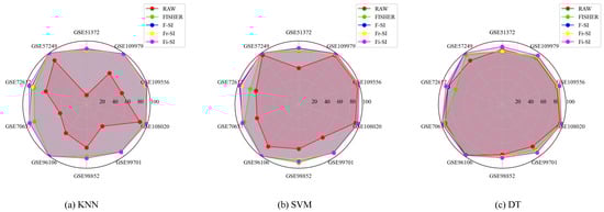 The calculation of the Friedman statistic value is facilitated by the aforementioned ranks in Table 11. The FMR in Table 11 allows for the computation of the corresponding statistics and under KNN, SVM, and DT classifiers using Formulas (22) and (23). Table 12 displays two sets of statistics that correspond to Table 11.