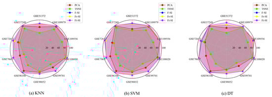 Comparison of classification accuracy (%) for three classifiers (KNN (a), SVM (b), DT (c)) with PCA and tSNE.