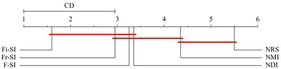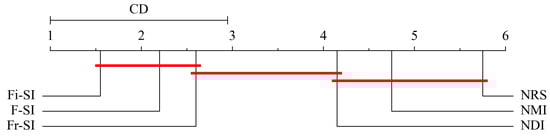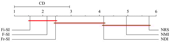 To judge whether the performance of the proposed algorithms exceed those of NDI, NMI and NRS, the Bonferroni–Dunn test is employed as post hoc analysis. In order to determine which algorithm differs significantly from the control algorithm, pairwise comparisons are performed between the algorithms. Following is the formula for the critical distance statistic (CD):