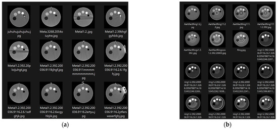 From the different image datasets, a model was created where the system was trained and tested as per the algorithm setup. The initial process flow was to collect and prepare data. Images of the different artefacts were taken and placed into a folder, and the folder was labelled per artefact, i.e., ring/metal artefact. The model algorithm was created based on the convolution model, and the input datasets were trained. The model training took 50 iterations, and after the iterations, the model was tested, and the output evaluation and the system resilience and accuracy were also tested. The system was trained and tested against a set of reconstructed image datasets and solutions. The system was trained with 50 iterations using machine learning techniques. Upon the completion of the iterations, the system was tested and evaluated against the unknown data. The system model was evaluated based on the Figure 3 design model on the unknown data, and these data were then used to determine the artefact type and possible solution(s). The image size used was 512 × 512 pixels per image, with the image dataset only focusing on metal and ring artefacts, as outlined in Figure 3a,b.