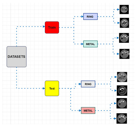 Two test datasets were placed in two different directories, namely (1) a training dataset and (2) a testing dataset, to enable a distinction between the trained dataset and the test dataset. The dataset was split into two different folder structures, as indicated in Figure 6.
