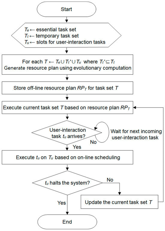 Additionally, for user-interaction tasks, task slots are pre-allocated within the offline schedule during the optimization process. When a user-interaction task arrives at runtime, it is dynamically scheduled using online scheduling within these reserved slots. We employ the Round-Robin algorithm for online scheduling, a widely used approach for interactive task scheduling in time-sharing systems [30]. Figure 2 illustrates the flowchart of the proposed method, outlining how resource planning and online adaptation are integrated. The following sections elaborate on the offline optimization process using evolutionary computation.