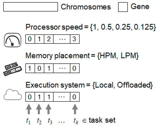 Chromosome encoding used in the evolutionary computation. Each of the three chromosomes encodes processor speed, memory placement, and execution location for the task set; each gene represents one task.