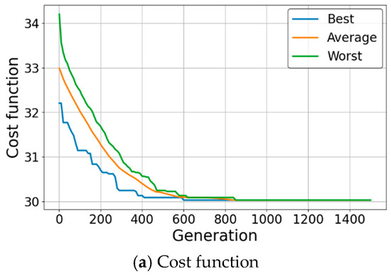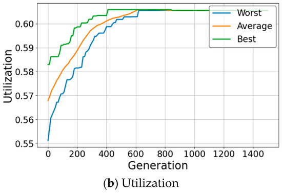 Rather than fixing the number of generations, we continue the evolutionary process until population convergence is achieved. Specifically, our evolutionary computation monitors the cost values of the individuals in the population and terminates the process when all individuals’ costs stabilize. Figure 4a illustrates the cost function trends of the population across generations, plotting the cost of the best individual, the worst individual, and the population average. As the figure shows, the cost function improves over time, and the population eventually converges. Importantly, the final converged population consists only of feasible schedules, ensuring that the optimization results satisfy both deadline constraints and energy efficiency. This is also confirmed by Figure 4b, where the utilization converges to a value less than 1.