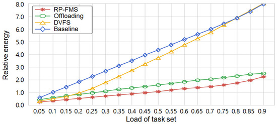 As shown in the figure, Baseline’s energy consumption increases almost proportionally with the task load. DVFS and Offloading reduce energy consumption by nearly 50% in the 0.1 to 0.2 load range. However, DVFS becomes ineffective as the load increases, eventually converging to Baseline. This is because, under high-load conditions, the processor operates at full speed, leaving little room for energy savings through DVFS. In contrast, Offloading remains effective regardless of load conditions, as task execution can still be transferred to remote servers. Specifically, both DVFS and Offloading show competitive performance under light loads ranging from 0.05 to 0.2, but Offloading proves more effective at higher loads between 0.3 and 0.9, where it achieves 38.0% to 68.6% greater energy savings than DVFS. RP-FMS outperforms both DVFS and Offloading across all load conditions, as it co-optimizes processor speed adjustments and offloading decisions.