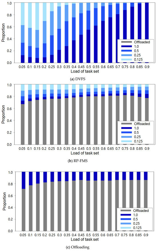 In contrast, Figure 6b illustrates that RP-FMS maintains a balanced distribution of processor speed across all load levels by jointly optimizing processor speed and task placement through offloading. Specifically, RP-FMS offloads approximately 65–75% of tasks. The offloading ratio increases as the load rises, but at peak load levels, it slightly decreases. This is because RP-FMS co-optimizes offloading and DVFS to identify the most energy-efficient configuration, rather than maximizing offloading indiscriminately.