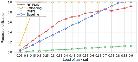 As shown in Figure 7, RP-FMS maintains higher utilization than Baseline, particularly when the load is not very high. This occurs because power-saving techniques are applied aggressively when the workload is not heavy. Offloading exhibits consistently low utilization since a large portion of tasks are executed on remote servers, although the local processor still runs at full speed. RP-FMS shows 22.9% and 770.6% higher processor utilization compared to Baseline and Offloading, respectively.