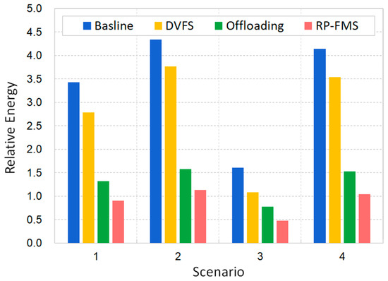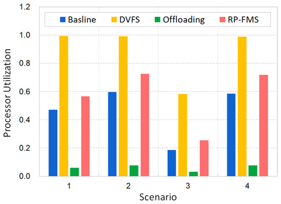 Figure 9 illustrates processor utilization across the four workload scenarios. As seen in Figure 9, DVFS maintains the highest resource utilization across all scenarios, as it dynamically adjusts processor speed to match workload conditions. Meanwhile, Offloading exhibits consistently low utilization since it does not adjust the processor speed for local tasks after migration, limiting further improvements in resource utilization. In contrast, RP-FMS maintains consistently high utilization by lowering the processor speed when idle slots remain after offloading. The observed improvements in processor utilization are 25.4% compared to Baseline and 820.7% compared to Offloading.