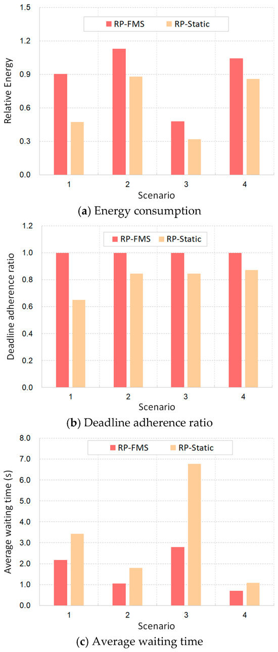Figure 10b illustrates the deadline-adherence ratio of both schemes. RP-FMS maintains a 100% deadline-adherence ratio across all workload scenarios, while RP-Static exhibits significant degradation in deadline adherence. The worst case occurs in Scenario 1, where the initial task load is low, but increases significantly for most of the execution time, leading to frequent deadline violations.