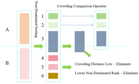 where and represent the function values of adjacent individuals for the objective , respectively, and and are the maximum and minimum values of the objective , respectively. This crowding distance ensures the uniform distribution of solutions in each non-dominated layer.
