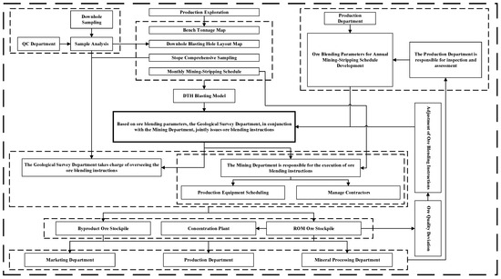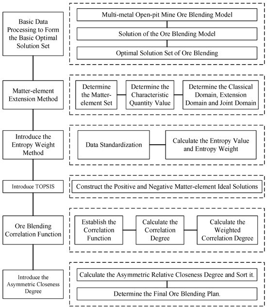 Through the above theories and schemes, the schematic diagram of the process of the ore blending scheme for the polymetallic open-pit mine constructed in this study is specifically shown in Figure 2.