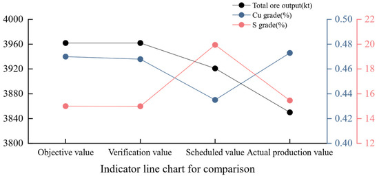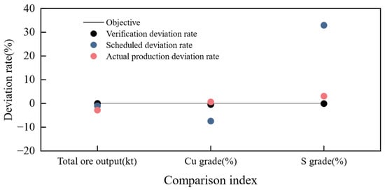 The model-verified scheme achieved the highest total production, with values closer to the ideal target compared to both the planned and actual production data. The Cu grade of the model-verified scheme fell between the planned and actual production values, demonstrating better alignment with the concentrator’s Cu grade requirements. The S grade of the model-verified scheme was lower than both the planned and actual production values, indicating better compliance with the concentrator’s S grade specifications.