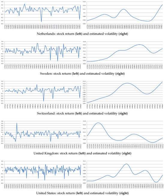 To estimate the time-varying volatility of returns, we apply the generalized kernel estimator described in Section 3.1. We use a fourth-order Epanechnikov kernel for improved boundary performance and reduced bias, as recommended in [16]. While the generalized kernel is theoretically more appealing, we found that the empirical results are robust to alternative kernel choices, including the quartic and Gaussian kernels. The bandwidths were selected using leave-one-out cross-validation using each country-specific sample. The volatilities of returns exhibit significant time variation across countries, as shown in Figure 1 and Figure 2. This provides empirical support for the identifying assumption of time-varying volatility. Furthermore, we calculate the correlation between between and to check whether the multicollinearity is avoided. The last column in Table 1 reports the corresponding correlations between and for each country. The correlations are all substantially below unity, consistent with the theoretical argument that time-varying volatility restores identification.