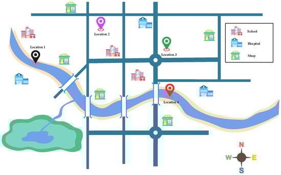 However, in real-world scenarios, many CMOPs exhibit multimodality [6,7], i.e., one CPF in the objective space maps to multiple CPSs in the decision space. Reference [8] may be the first to define this problem type as constrained multimodal multi-objective optimization problems (CMMOPs). To facilitate an intuitive understanding of CMMOPs, we employ a real-world location-selection problem as an example. Figure 1 is an actual example of a CMMOP, where the problem aims to enable the tenant to not only find the location with the shortest distance to reach schools, hospitals, and convenience stores but also the selected location that avoids the constraints of roads, bridges, and rivers. In Figure 1, there are four locations satisfying the shortest distance, i.e., Location 1–4. Since Location 1 and Location 4 are both positioned in the river, it is obvious that they are infeasible siting schemes, while Location 2 and Location 3 are both located within the feasible region and from two different PSs; thus, these two siting schemes can satisfy the needs of the tenants.