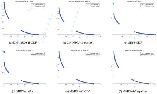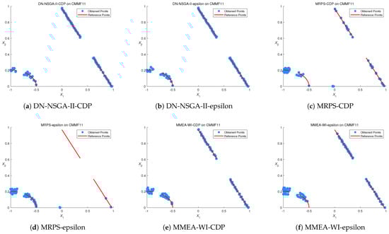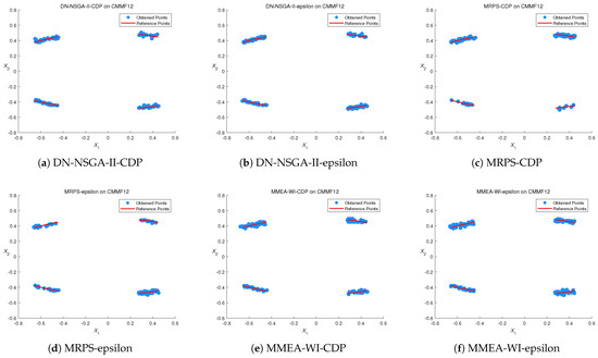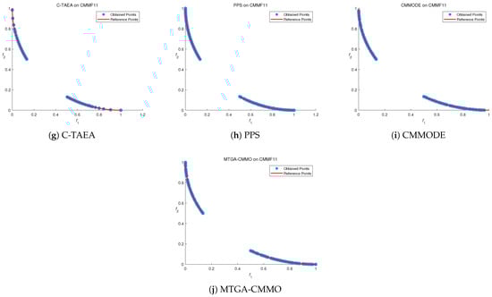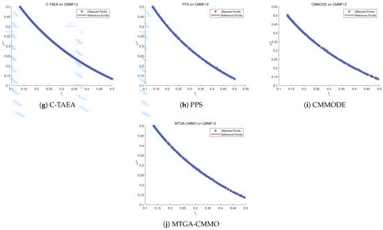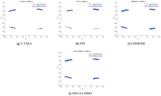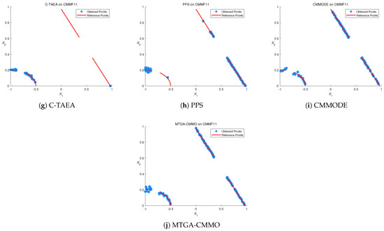 Table 5 presents the average IGDX values obtained by MTGA-CMMO and the different variants on 31 test problems. From Table 5, it can be seen that MTGA-CMMO obtained the smallest average IGDX values on 21 of 31 test problems. MTGA-CMMO-V1 does not derive the smallest average IGDX value for any of the test problems, suggesting that auxiliary task 1 in MTGA-CMMO does not consider the constraints. However, it may assist the main task population in traversing infeasible obstacle areas and increase the algorithm’s global searching ability. Some of the infeasible solutions in the later stages of iteration do not deliver valuable knowledge to the main population; thus, the strategy of dynamically adjusting the constraint boundaries of auxiliary task 1 in MTGA-CMMO is necessary. MTGA-CMMO-V2 obtains the smallest average IGDX value on CMMF1, CMMF9, and CMMF12; however, following statistical analysis, MTGA-CMMO-V2 significantly outperforms MTGA-CMMO only on the CMMF12 problem, while the experimental results on the other two test problems are approximately the same as those of MTGA-CMMO. This indicates that auxiliary task 2 helps develop the exploitation capability of MTGA-CMMO. MTGA-CMMO-V3 and MTGA-CMMO-V4 attain the smallest average IGDX values on two test problems each, even though following statistical analysis they do not have any significant advantage over MTGA-CMMO. This demonstrates that under the multitasking optimization framework designed in this paper, mating selection based on the decision space probabilistic information can contribute to obtaining more CPSs with better distribution and convergence. MTGA-CMMO-V5 obtains the smallest average IGDX value for only three test problems, significantly less than that of MTGA-CMMO. The experimental results illustrate that under the novel multitasking optimization architecture, designing the specific environmental selection strategies for different optimization tasks is more effective than adopting the SCD approach in each optimization task. Moreover, according to the Wilcoxon rank-sum test, MTGA-CMMO has a significant advantage over MTGA-CMMO-V1, MTGA-CMMO-V2, MTGA-CMMO-V3, and MTGA-CMMO-V5 on nearly half of 31 test instances, and the results are similar to those of these four variants on the remaining test problems. Compared to MTGA-CMMO-V4, MTGA-CMMO is superior on only 11 test questions. The reason why the advantage of MTGA-CMMO over MTGA-CMMO-V4 is not highly significant may be that MTGA-CMMO-V4 employs a random mating selection strategy, which increases the diversity of the algorithm and may contribute to searching for all the CPSs.