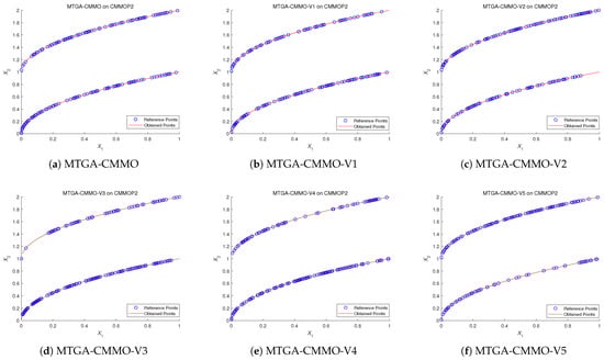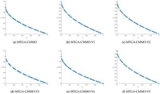 To visualize the advantages of MTGA-CMMO over the other variants, we plot the distribution of CPSs and CPFs obtained by MTGA-CMMO and the other five variants on CMMOP2, a representative CMMOP with two CPSs, as shown in Figure 7. MTGA-CMMO and its five variants all obtained two CPSs for CMMOP2. Nevertheless, the number of optimal solutions obtained for MTGA-CMMO-V3, MTGA-CMMO-V4, and MTGA-CMMO-V5 on the two CPSs differs considerably. Although the number of optimal solutions obtained by MTGA-CMMO-V1 and MTGA-CMMO-V2 on the two CPSs is relatively balanced, the distribution of optimal solutions on each CPS is not as uniform as that obtained by MTGA-CMMO. Additionally, as seen in Figure 8, the PF obtained by MTGA-CMMO and the five other variant algorithms on CMMOP2 showed no significant difference.