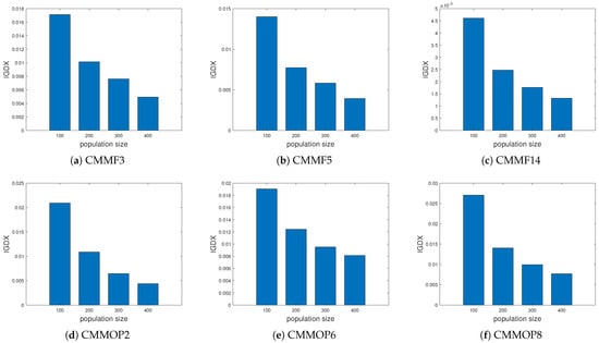 First, the population size is selected sequentially as 100, 200, 300, and 400 and tested based on the average IGDX values on six representative test problems; the test results are demonstrated in Figure 9. As the population size increases, the average IGDX values obtained by MTGA-CMMO on all six test problems exhibit a decreasing trend, indicating that the performance of MTGA-CMMO improves with the growing population size. It is worth noting that the decrease in the mean IGDX value for increasing the population size from 100 to 200 displayed greater changes on all six test problems than those caused by the increase in population size in the other cases. Additionally, an increase in population size will bring about an increase in computational cost, therefore, we deem it more suitable to establish the population size at 200.