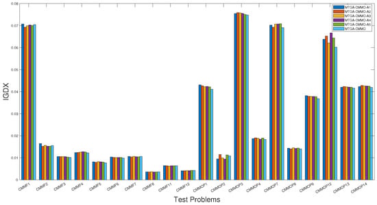 The mean IGDX indicator generated by MTGA-CMMO and its five variants on 31 test problems.