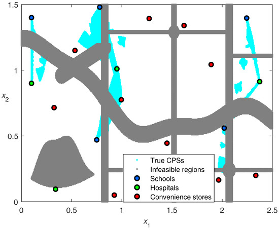 where , and represent the locations of 5 schools, 4 hospitals, and 10 convenience stores, respectively. The lake, river, and bridges in the search space, which compose the infeasible regions, are denoted as , , and , respectively. The function stands for the Euclidean distance between the candidate location and the objective site. Figure 11 shows the true CPS distribution on the CMMLP.