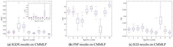 The box-plots of the results for comparison algorithms on IGDX, PSP, and IGD indicator, respective. 1 = DN-NSGA-II-CDP, 2 = DN-NSGA-II-epsilon, 3 = MRPS-CDP, 4 = MRPS-epsilon, 5 = MMEA-WI-CDP, 6 = MMEA-WI-epsilon, 7 = C-TAEA, 8 = PPS, 9 = CMMODE, 10 = MTGA-CMMO.