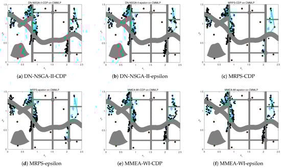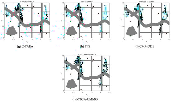 In this subsection, MTGA-CMMO is compared with nine comparison algorithms on the CMMLP to validate the ability of MTGA-CMMO to solve real-world problems. The population size and the maximum evaluation number are 200 and 200,000, respectively. Each comparison algorithm runs 21 times independently. Figure 12 displays the box plots of the comparison algorithms on the CMMLP based on the IGDX, PSP, and IGD metrics, respectively. In Figure 12a,b, MTGA-CMMO obtains both the minimum value of the median of IGDX and the maximum value of the median of PSP as well as the smallest size of the box plot, indicating that MTGA-CMMO can obtain better decision space experimental results than the other nine comparison algorithms on the CMMLP. In addition, as shown in Figure 12c, MTGA-CMMO significantly outperforms the other eight comparison algorithms except for C-TAEA in IGD metrics. The performance of C-TAEA in the objective space is similar to that of MTGA-CMMO, which may be attributed to the fact that C-TAEA constructs a diversity archive for retaining the additional promising infeasible solutions. To visualize the experimental results, the distribution of the obtained CPSs based on the median IGDX for all comparison algorithms is illustrated in Figure 13. Obviously, DN-NSGA-II-CDP, DN-NSGA-II-epsilon, MMEI-WI-CDP, MMEI-WI-epsilon, CMMODE, and MTGA-CMMO can obtain all the CPSs. Furthermore, MTGA-CMMO has a more even distribution in all the CPSs, and the reason for this may be that two auxiliary tasks migrate the individuals with better performance in the decision space to the main task to facilitate the evolutionary process of the main task. From Figure 12 and Figure 13, it is evident that the performance of MTGA-CMMO is superior to the other nine comparison algorithms on CMMLP.