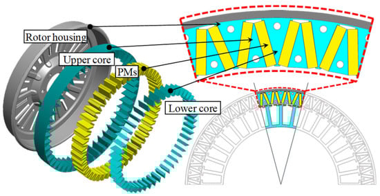As the industrial requirement for high-performance electric motors has been growing in recent years, various types of electric motors, such as the permanent magnet synchronous motor (PMSM), have been widely investigated. Electric motors are classified according to their rotating part as being either external rotor or internal rotor types. Compared with internal rotor motors, external rotor motors have a larger stator slot area, which is responsible for increasing the torque-producing capability [,,,].