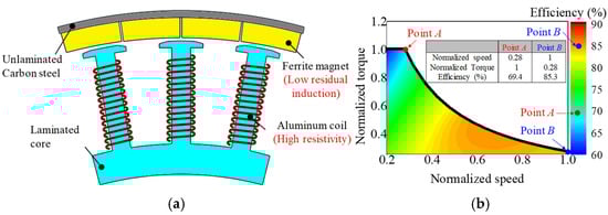 Figure 2a shows the conventional SPMSM that is currently being used for the targeted home appliance. As the targeted system mainly operates at two points, the efficiency of the conventional model had to be improved at the two main operating points, high-torque-and-low-speed point A and low-torque-and-high-speed point B, as shown in Figure 2b. In this section, the conventional model is analyzed based on a statistical method. The motor characteristics such as the current and the loss are calculated using the d- and q-axis equivalent circuit method combined with FEA []. Contrary to the stator using laminated cores, the rotor housing of the conventional model consists of carbon steel, which is an unlaminated core. As the unlaminated carbon steel has a magnetic property, the PMs were directly attached to the rotor housing. Considering the costs, it was decided to use ferrite magnets and aluminum coils. Because the residual induction of ferrite PMs is low and the resistivity of aluminum coils is high, the efficiency of the conventional SPMSM is low at both points. Especially, the efficiency at point A is lower than that at point B. Accordingly, priority consideration is given to point A efficiency when deciding design directions for efficiency improvement.
