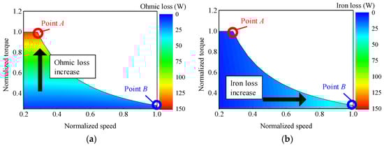 In this paper, two losses of the PMSM that much affected motor efficiency were considered: ohmic loss and iron loss. The ohmic and iron losses of the conventional SPMSM are shown in Figure 3. The ohmic loss of the PMSM is generated in the stator winding coils and determined by the resistance and input current. The resistance is related to the length and the cross-sectional area of the coils, as well as the resistivity of the coil material. The magnitude of the current is determined by the circuit parameters and operating point. As shown in Figure 3a, it is evident that the ohmic loss increases as the torque increases, since the output torque is proportional to the current. As a result, the ohmic loss is the largest at point A, and has a greater effect on point A efficiency than the iron loss. The other loss is the iron loss generated in the stator and rotor core. The magnitude and frequency of the magnetic flux density on the cores affect the amount of iron loss, which means that the iron loss is determined by the material properties and the rotating speed. As the rotating speed increases, the fundamental frequency of the SPMSM also increases, which leads to a significant rise in iron loss, as shown in Figure 3b.