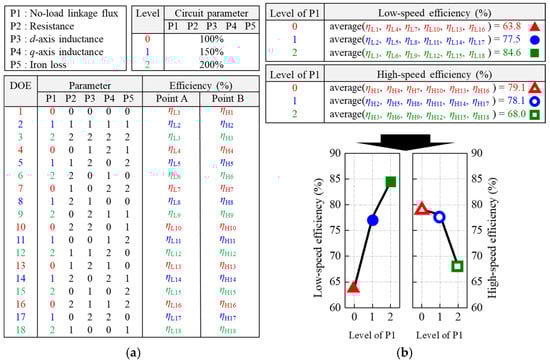 To determine the design directions for improving the efficiency at both points A and B, the effects of the circuit parameters on each efficiency are statistically investigated []. The circuit parameters are selected from Equations (1)–(6): these are the linkage flux at no load, the resistance, the d-axis inductance, the q-axis inductance, and the iron loss. The three-level design is written based on the orthogonal array method, and the 18 design of experiments (DOE) samples are presented in Figure 4a.