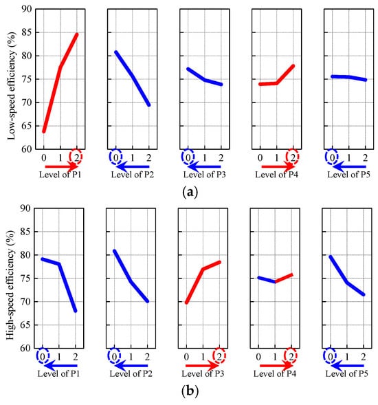Following the DOE table constructed using the orthogonal array method, the circuit parameters are varied across 18 samples, and the efficiencies at point A and B are calculated using the equivalent circuit combined with FEA. To analyze the influence of each parameter independently, main effects analysis is conducted. Each parameter has three levels (levels 0, 1, and 2), and the samples are grouped accordingly. Within each level group, the average efficiency is calculated. The difference in these averages across levels represents the “main effect” of that parameter on efficiency. Figure 4b shows this procedure using the no-load linkage flux (P1) as an example. The plot shows how the average efficiency changes with increasing parameter level, indicating the degree and direction of its influence. Through this process, the main effects of each parameter are analyzed considering variation in the other parameters [].