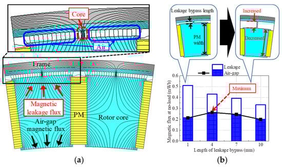 Magnetic characteristics of external rotor spoke-type PMSM at no load: (a) Magnetic flux lines; (b) Magnetic flux according to leakage bypass length.