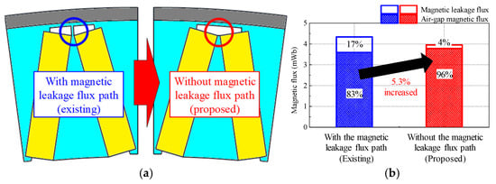 The magnetic reluctance of the path between the upper and lower cores is large enough to reduce the magnetic leakage flux. Accordingly, the air gap magnetic flux produced by the PMs is increased, as shown in Figure 7b. In this comparison, the PM and core material, rotor size, and pole arc were the same. The stator core is assumed to be flat and has an infinite relative permeability property. In the existing V-shaped rotor that includes the connection structure in the rotor core, 17% of the magnetic leakage flux is generated. Whereas only 4% of the magnetic leakage flux is generated in the proposed V-shaped rotor without the magnetic leakage flux. A leakage flux of 39% occurs in the spoke type with the magnetic leakage flux path, and a leakage flux of 17% occurs in the V-shaped type with the magnetic leakage flux path. Therefore, the air gap magnetic flux produced by the PMs is the largest when applying the proposed V-shaped rotor.