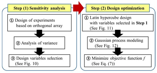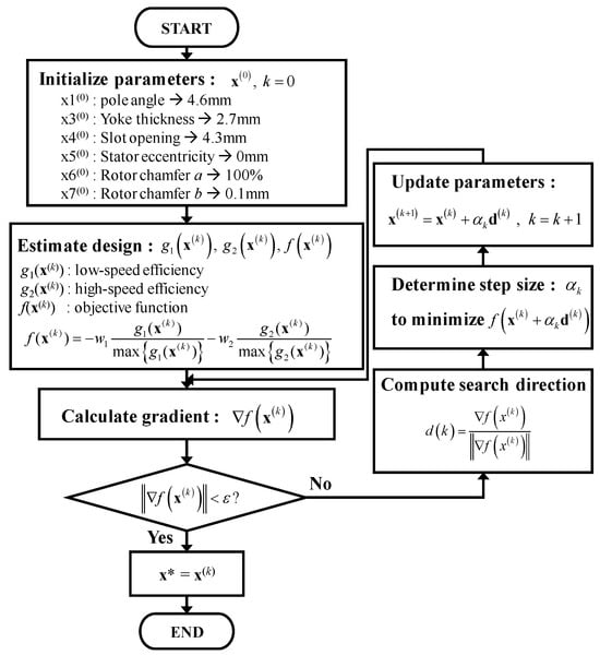 A flow chart of the optimization is shown in Figure 13. First, the design variables are initialized. With the constructed GPMs, the values of the efficiency at points A and B are predicted. Thus, the defined objective function is calculated. Then, a gradient of the objective function is calculated. Until the gradient value of the objective function is less than epsilon, the computation of the search direction, determination of the step size, and updating of the design variables are continued. If the gradient value converges, the optimization ends. As a result, the objective function is minimized and the optimum point is found, as shown in Figure 14. The optimized design variables are presented in Table 2.