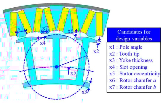 The computational costs required for design optimization are related to the number of design variables. To reduce the computational cost, the design variables that have statistically significant effects on point A and B efficiencies are selected in this section. The constant geometry dimensions and candidates for design variables are presented in Figure 9. Based on analysis on variance (ANOVA), the sensitivity of each efficiency is investigated considering the seven candidates. Based on the orthogonal array method, 36 DOE points were constructed. After calculating the probability value (p-value) of the seven candidate variables using ANOVA, those with p-values less than the significance level of 0.05 were considered to have statistically significant effects on efficiency [,]. For point A (low-speed operation), five variables were selected: pole angle, yoke thickness, slot opening, stator eccentricity, and rotor chamfer b. For point B (high-speed operation), six variables were significant: pole angle, yoke thickness, slot opening, stator eccentricity, and both rotor chamfers a and b. These parameters were chosen for the optimization process because they directly impact the magnetic circuit geometry and flux distribution. Their variation leads to notable changes in iron loss, flux-weakening performance, and output torque, which are key to achieving optimal efficiency across both operating conditions.