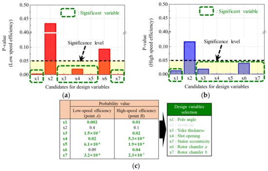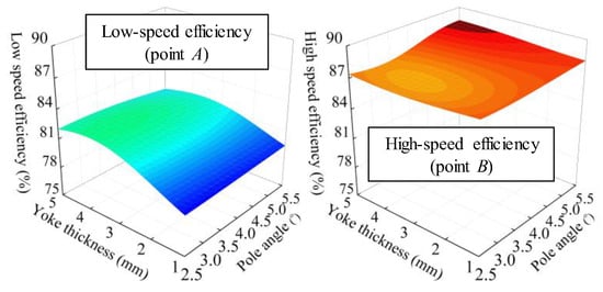 Figure 10 presents the ANOVA results for each efficiency, showing the design variables that are significant for low- and high-speed efficiency. It is evident that pole angle, yoke thickness, slot opening, stator eccentricity, and rotor chamfer b are significant for low-speed efficiency. Similarly, six design variables are significant for high-speed efficiency: pole angle, yoke thickness, slot opening, stator eccentricity, and rotor chamfers a and b. The tooth tip has a negligible effect on the efficiency at both speeds; therefore, its initial value is used in the design optimization.