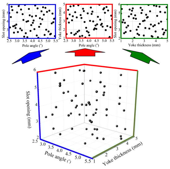 Latin hypercube design points according to pole angle, yoke thickness, and slot opening.