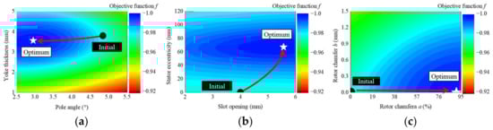 Design optimization: (a) Pole angle and Yoke thickness; (b) slot opening and stator eccentricity; (c) Rotor chamfers a and b.