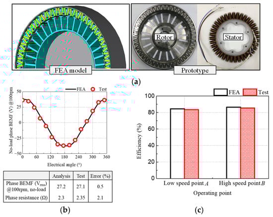 Improved model: (a) FEA model and prototype; (b) No-load back-electromotive force and resistance; (c) Efficiency.