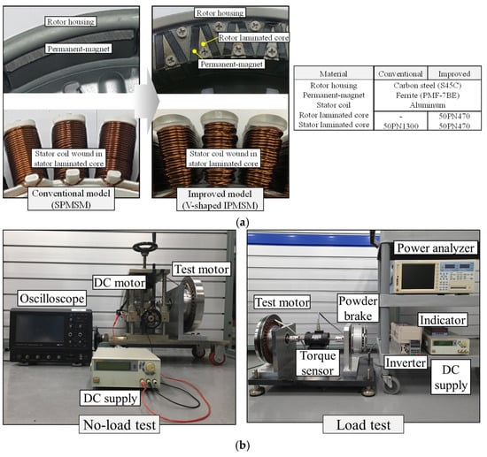 In this section, the optimized V-shaped IPMSM without the magnetic leakage flux path is termed the improved model. Then, the efficiencies of the improved model and the conventional model are experimentally tested and compared. Both models are optimized, respectively. The prototypes of both models are presented in Figure 16a. The set-ups for the no load and load tests are presented in Figure 16b. For the no load test, a DC motor is used to rotate the test motor. The test motor is connected to a Y-connected resistor, which has a very large resistance. While the test motor is rotated, the voltage of the Y-connected resistor is measured using an oscilloscope. The measured voltage represents the BEMF. For the load test, both the conventional and proposed models are evaluated under the same inverter-fed conditions to ensure a fair comparison. The torque, speed, and input power are measured, and the efficiency at each operating point are calculated according to the following equation: