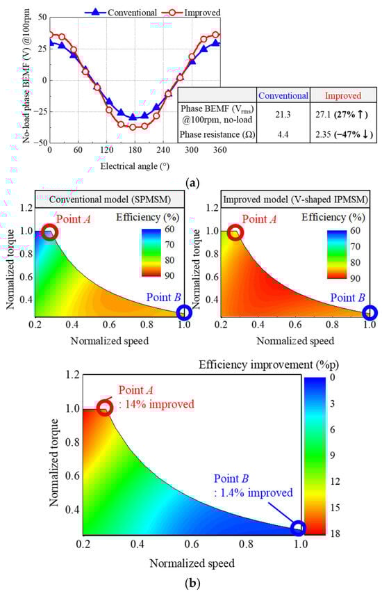 where η is the efficiency, T is the torque, ω is the rotating speed, and Pin is the input power. As shown in Figure 17a, the increased flux and reduced resistance of the improved model, compared with the conventional model, are validated by measuring the BEMF and phase resistance. The BEMF of the proposed model is enhanced by 27%, and the resistance is reduced by 47%. Figure 17b illustrates the degree of improvement in the efficiency of the proposed model. By conducting the design optimization for the efficiency at low- and high-speed operating points where the motor characteristics are different, the overall efficiency of the proposed model is increased throughout the torque and speed. Compared with the conventional model, the efficiency of the proposed model is improved by 14%p at low-speed point A, 1.4%p at high-speed point B, and 10.2%p on average.