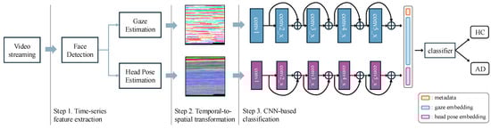 Our goal is to enhance diagnostic accuracy by analyzing gaze and head movement patterns extracted from video streams. As illustrated in Figure 1, our framework consists of three key stages: (1) time-series feature extraction—extracting gaze and head pose sequences from video data; (2) temporal-to-spatial transformation—converting 1D time-series features into 2D spatial representations; (3) CNN-based classification—using a dual-pathway CNN to detect AD-related patterns from the transformed visual features.