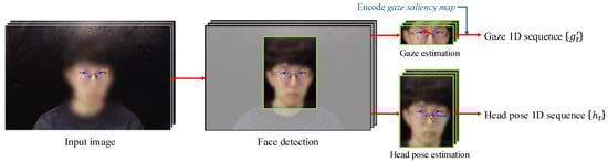 Figure 2 summarizes the feature extraction process. For each frame t in the input video, we first detect the facial region using RetinaFace [], which precisely isolates the face from the background. The detected face is then cropped and resized to , forming a 2D facial image sequence . This sequence is processed using two separate pretrained networks, L2CS-Net [] for gaze estimation and 6DRepNet [] for head pose estimation, to obtain the 1D gaze sequence and 1D head pose sequence . Both L2CS-Net and 6DRepNet are optimized for robust performance under various conditions to ensure accurate feature extraction.