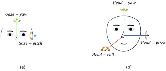 Coordinate axes: (a) gaze and (b) head pose. The arrows indicate the positive directions of each rotational axis, and the colors represent axis orientation: blue for pitch-axis, green for yaw-axis, and red for roll-axis.