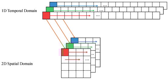 Transformation of 1D temporal sequence into a 2D spatial representation using a row-wise mapping approach. The arrows indicate the direction of data flow, and the colors represent different channel segments being mapped to spatial rows.